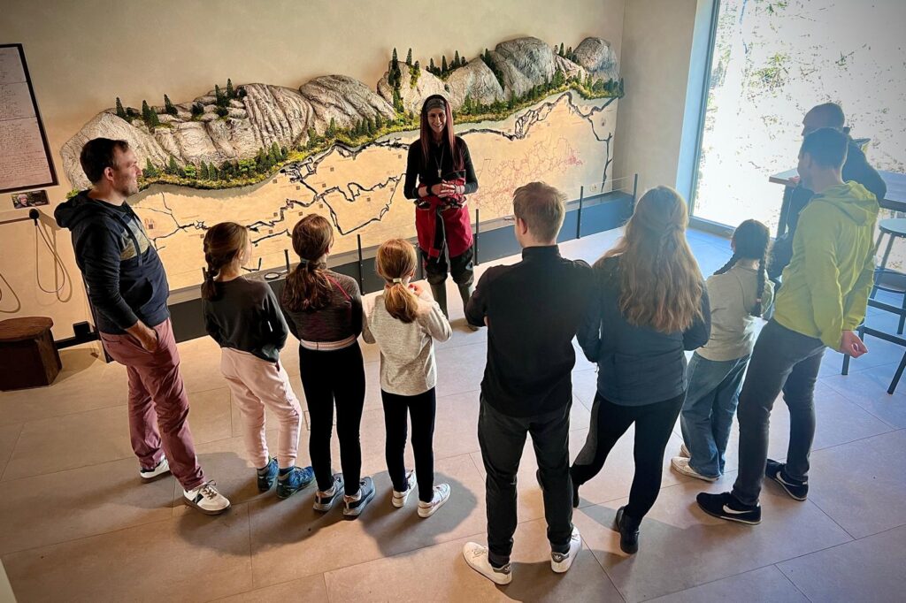 Instruktionen vor der Tour an der Höhlenwand im neuen Hölloch-Center.